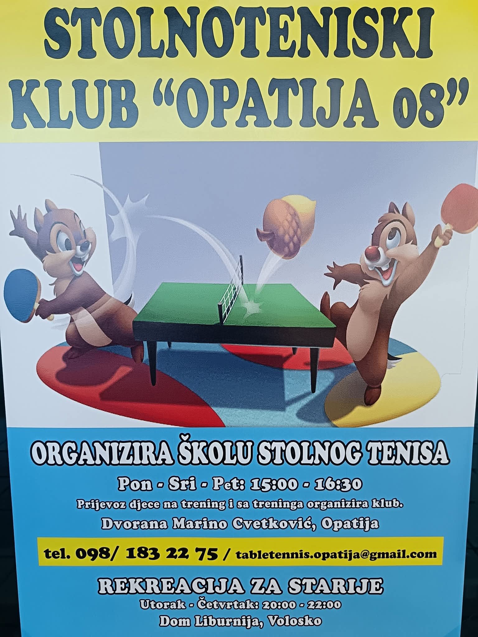 Treniramo u Sportskoj dvorani Marino Cvetković te u Domu Liburnija, a gostujemo i u raznim školskim te vrtićkim dvoranama, kako bi što više mladih uključili u naš rad i sportski odgoj. Sudjelujemo na lokalnim, regionalnim, državnim i međunarodnim natjecanjima u raznim kategorijama. Osim što igramo i stolnoteniske lige pod okriljem Hrvatskog stolnoteniskog saveza, organiziramo kampove i sportska druženja.